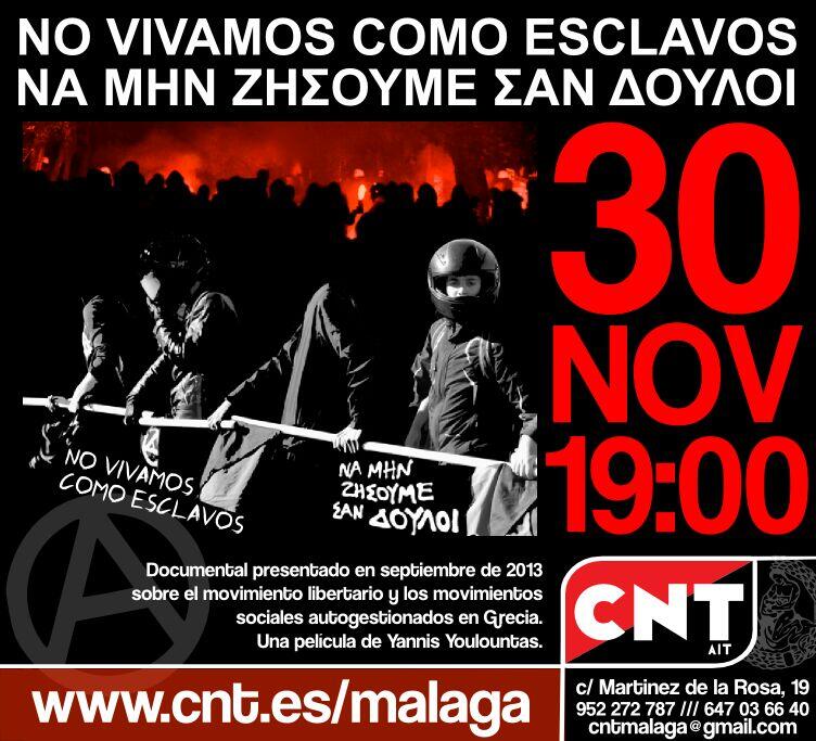 Estáis invitados, sábado 30 de noviembre, a las 19 horas, a la sede de la CNT-AIT de Málaga. Tendremos un nuevo encuentro dentro de las Jornadas Libertarias 2013 en el que se proyectará un documental de Yannis Youlountas sobre el movimiento libertario y los movimientos sociales autogestionados en Grecia.